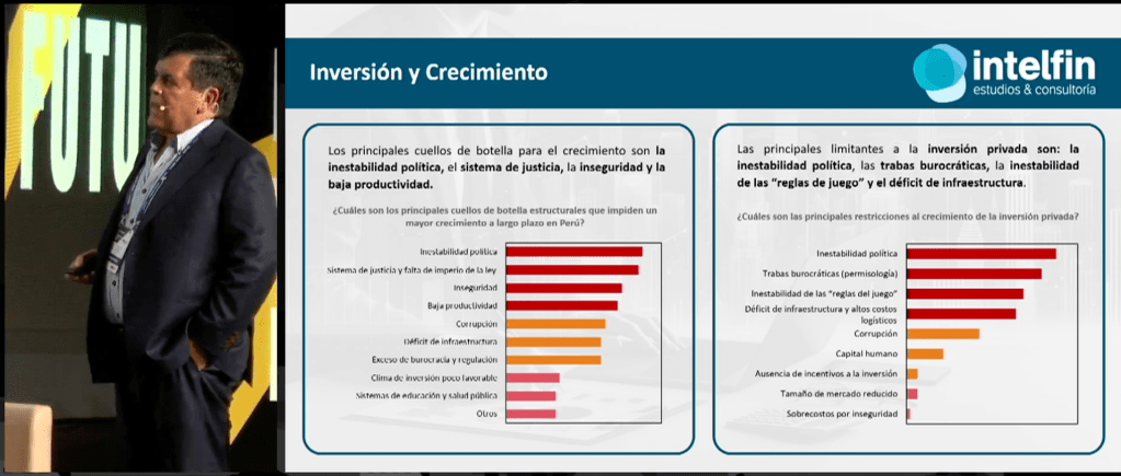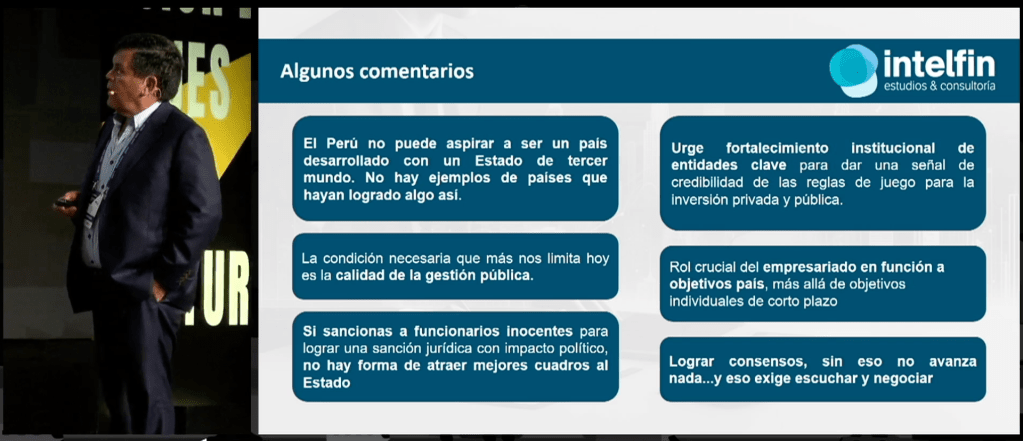 Carlos Paredes, socio fundador de Intelfin Estudios y Consultoría, enfatizó que el Perú enfrenta desafíos estructurales que no pueden ser superados sin una reforma profunda en la gestión estatal. “La inversión privada es fundamental, pero sin un Estado eficiente, no lograremos el impacto que necesitamos,” afirmó. Según Paredes, la corrupción, la inestabilidad política y la falta de un sistema de justicia efectivo han sido barreras históricas que limitan el potencial del país. Para superar estos problemas, propuso trabajar en un modelo de colaboración que combine la capacidad innovadora del sector privado con un Estado que garantice regulaciones claras y servicios públicos de calidad.
