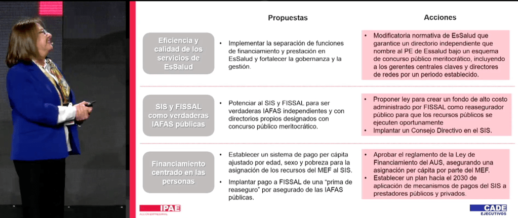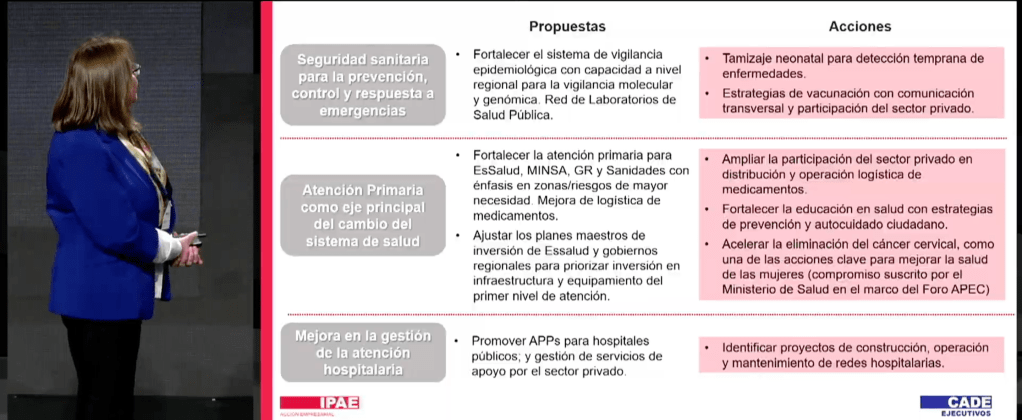 En ese sentido, planteó la reflexión sobre la situación de EsSalud y el Sistema Integral de Salud (SIS); el fortalecimiento del primer nivel de atención, mejorando su sinergia con la salud comunitaria y las iniciativas de salud pública; mejorar la gestión de la atención hospitalaria (promoción de asociaciones público-privadas); la urgencia del problema de abastecimiento de medicamentos esenciales, garantizando su disponibilidad y una distribución eficiente en todo el país; y la necesidad de diálogo para fortalecer la innovación; y la importancia de generar confianza entre los diferentes actores involucrados en el sector salud; entre otros.