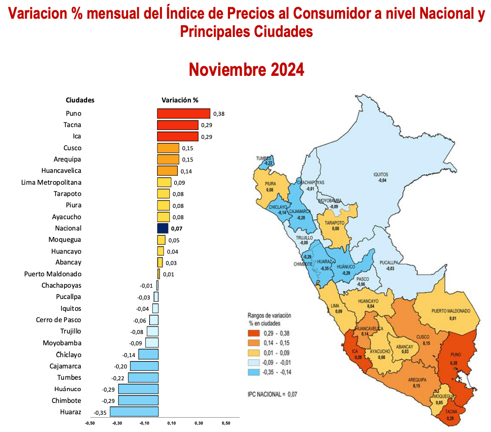 El IPC, que mide la variación de precios en bienes y servicios esenciales, subió en catorce ciudades. Destacan Puno (0,38%), Ica y Tacna (0,29%), mientras que el IPC Nacional alcanzó un moderado 0,07%. Entre las causas del alza están el incremento en alimentos como bonito, jurel, y palta, así como servicios esenciales como electricidad y streaming. Por otro lado, ciudades como Huaraz (-0,35%) y Chimbote (-0,29%) experimentaron caídas, influenciadas por la reducción en precios de productos básicos como papa y mango.