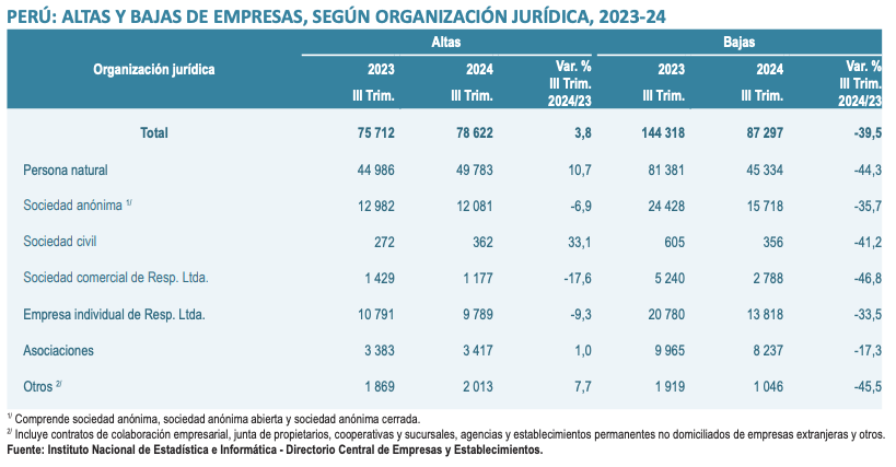 En el III Trimestre de 2024, comparado con similar periodo del año anterior, se registró un incremento de empresas nuevas y/o reactivadas constituidas como sociedad civil (33,1%), persona natural (10,7%), otras formas de organización jurídica (7,7%) y asociaciones (1,0%). Mientras que, disminuyó la cantidad de empresas dadas de alta constituidas como sociedad comercial de responsabilidad limitada (-17,6%), empresa individual de responsabilidad limitada (-9,3%) y sociedad anónima (-6,9%). Según organización jurídica, resaltó la disminución de empresas dadas de baja constituidas como sociedad comercial de responsabilidad limitada (-46,8%), seguido de otras formas de organización jurídica (-45,5%), persona natural (-44,3%) y sociedad civil (-41,2%).