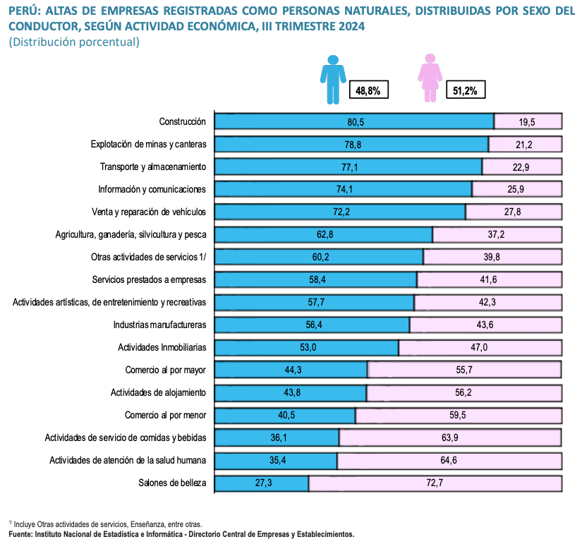 Comercio al por menor (59,5%), Actividades de alojamiento (56,2%) y Comercio al por mayor (55,7%). En el caso de los hombres, representaron un mayor porcentaje en la conducción de empresas de Construcción (80,5%), destacando los departamentos de Lima, Piura y La Libertad; seguida por Explotación de minas y canteras (78,8%), Transporte y almacenamiento (77,1%), Información y comunicaciones (74,1%), Venta y