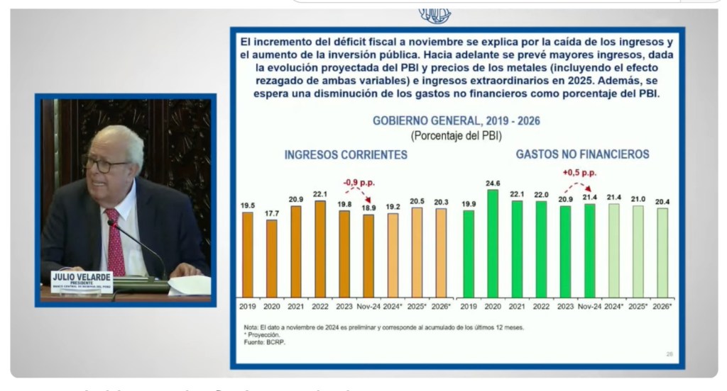 Julio Velarde, presidente del BCRP, manifestó su preocupación al respecto: “No estamos acostumbrados a déficits de esta magnitud, y no es sostenible para la economía peruana”. Comparó el actual escenario con el de 1992, cuando el déficit alcanzó el 4% del PBI. Velarde señaló que, si bien el nivel de déficit es bajo en comparación con otros países de la región, resulta elevado y preocupante para los estándares peruanos.