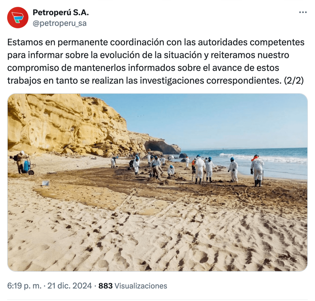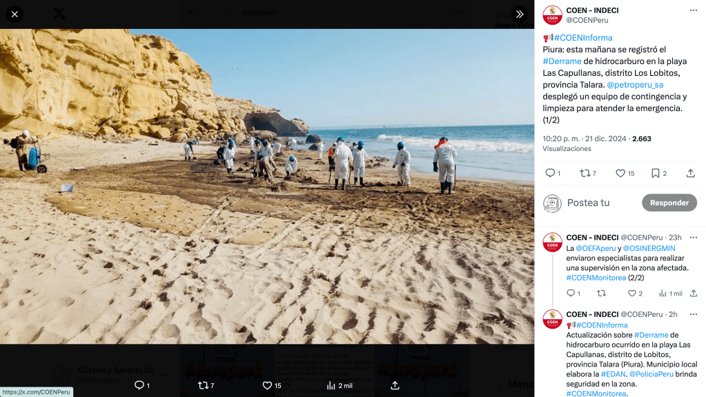 El pasado viernes, una nueva mancha oscureció las costas del norte peruano. Petroperú, la empresa estatal de hidrocarburos, confirmó un derrame de petróleo en su terminal submarino de la Refinería de Talara, con hidrocarburos detectados en la playa Las Capullanas al día siguiente. Mientras el crudo alcanzaba la orilla y afectaba al menos cuatro playas de la región Piura, la reacción de la compañía se limitó a un escueto comunicado y medidas de limpieza tardías.
