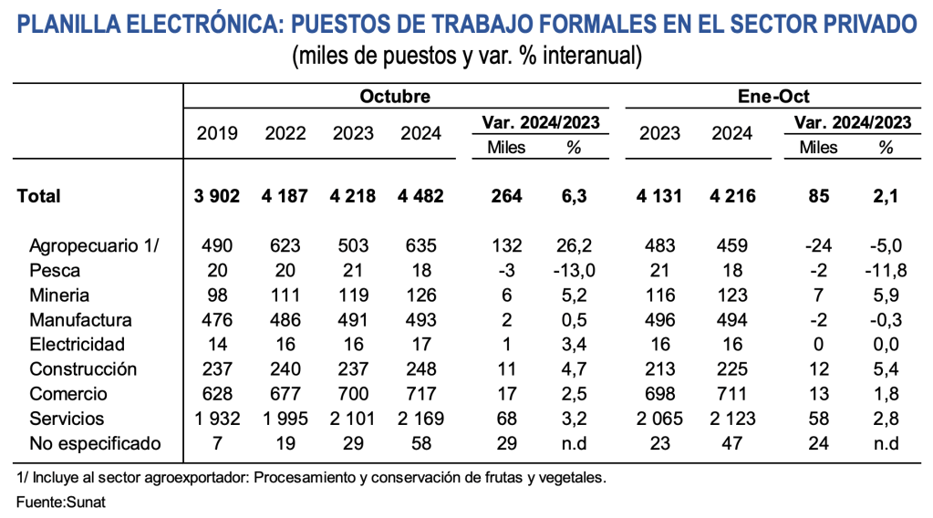 El sector agropecuario ha sido uno de los principales motores de este repunte. Según el informe, el empleo formal en este rubro ha mostrado una significativa mejora en los últimos meses, alcanzando un incremento interanual del 26.2% a octubre de 2024. Este crecimiento se asocia con el impulso de la agroexportación y las actividades relacionadas con la conservación de productos agrícolas, lo que refleja un efecto positivo en la generación de empleo en zonas rurales.