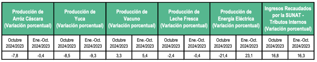 La producción de arroz cáscara, en octubre de 2024, totalizó 14 mil 867 toneladas y bajó en 7,8%, cotejado con igual mes del año anterior que fue 16 mil 120 toneladas, como consecuencia de las menores áreas cosechadas. A su vez, la producción de yuca reportó 15 mil 861 toneladas y disminuyó en 8,5%, comparado con el décimo mes del año pasado que logró 17 mil 334 toneladas, debido a las inferiores cosechas. También, se redujo la producción de maíz amarillo duro (-78,2%), papa (-33,1%), piña (-32,0%), papaya (-20,6%) y plátano (-1,3%), entre otros. Por el contrario, se elevó la producción de maíz amiláceo (359,8%), café (63,4%), naranja (52,5%), zapallo (50,0%) y zanahoria (25,1%), entre los más destacados.