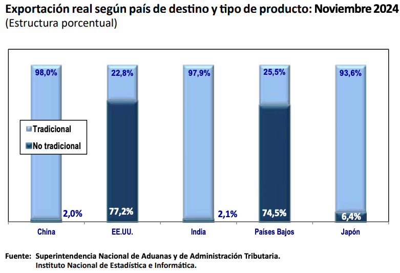 En noviembre de 2024, los principales destinos de las exportaciones peruanas fueron China, Estados Unidos y la India. China encabezó la lista, con un 38,2% del valor total exportado, seguida de Estados Unidos con un 15,5% e India con un 5,3%.