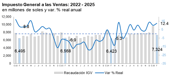 La recaudación por IGV ascendió a S/ 7 324 millones, con un crecimiento del 12,4%.- IGV Interno: S/ 4 250 millones (+11,0%), impulsado por el consumo y la aplicación del IGV a plataformas digitales.