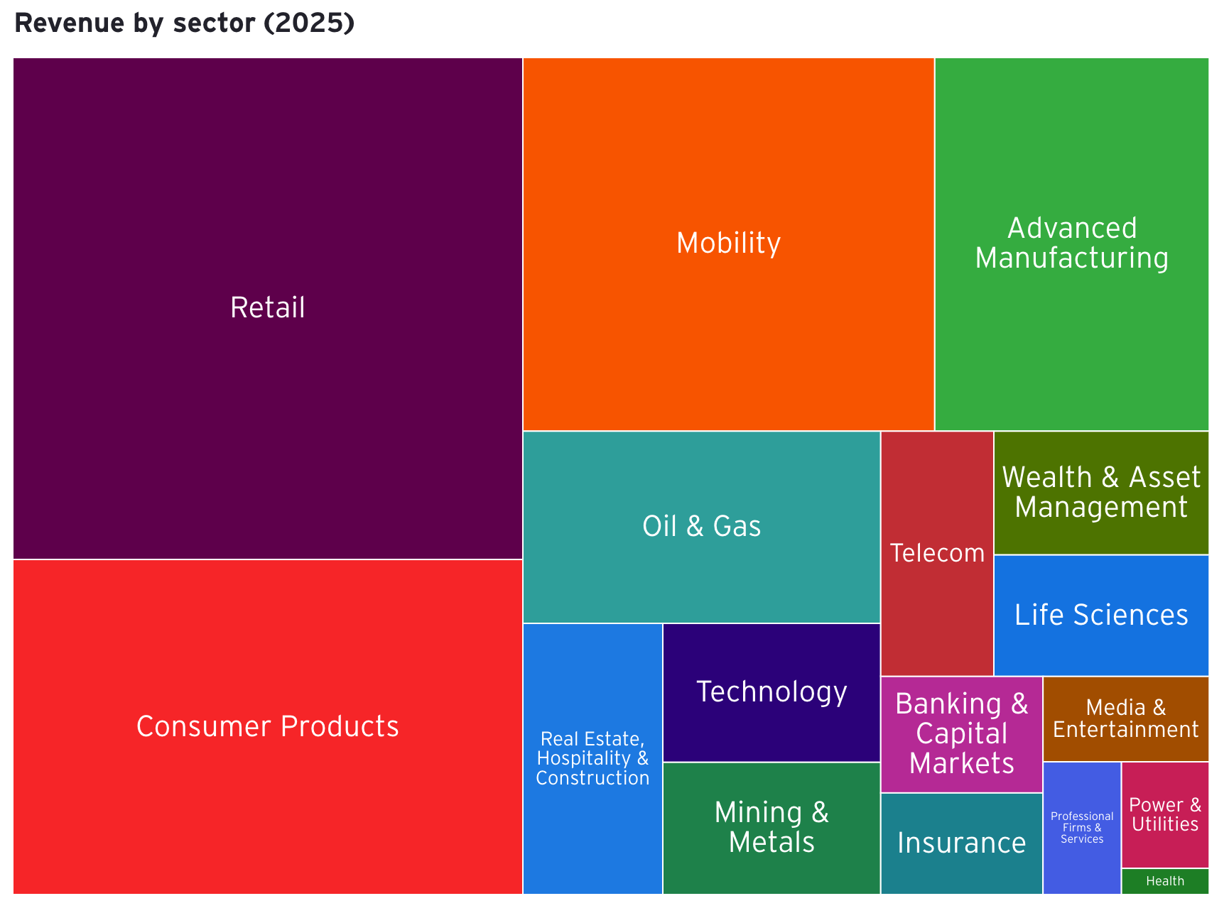 El impacto económico de estas empresas también se extiende a los sectores en los que operan. El sector minorista es el de mayor representación, con un 20% de las empresas del índice, que contribuyen con el 26% de los ingresos agregados. Sin embargo, los sectores de productos de consumo, manufactura avanzada y movilidad también juegan un papel fundamental. De hecho, Alemania es el país con mayor número de empresas en estos sectores, destacándose en manufactura avanzada y movilidad, con empresas como Volkswagen, BMW y el Grupo Schwarz.