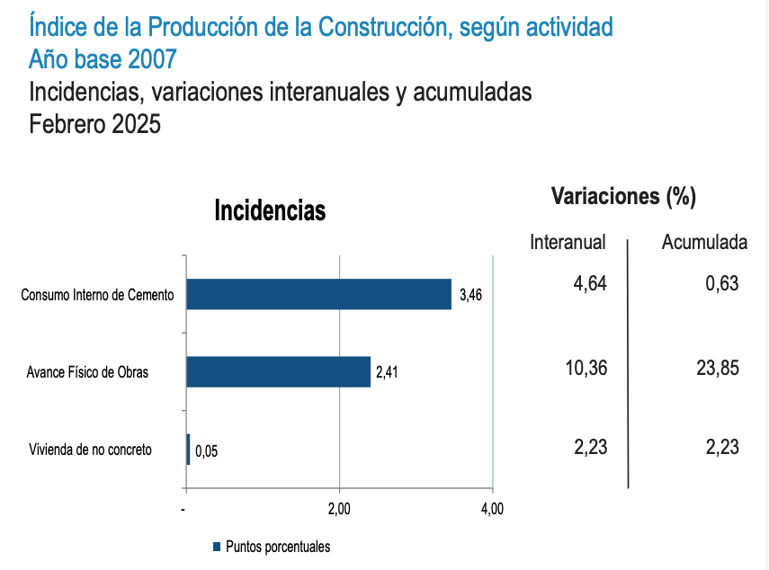 📢 El sector construcción registró un crecimiento de 5,91% en febrero de 2025, según el INEI. Este desempeño estuvo sustentado en el mayor consumo interno de cemento (+4,64%) y el avance físico de obras (+10,36%), lo que refleja una recuperación sostenida tanto del sector público como de la autoconstrucción privada.