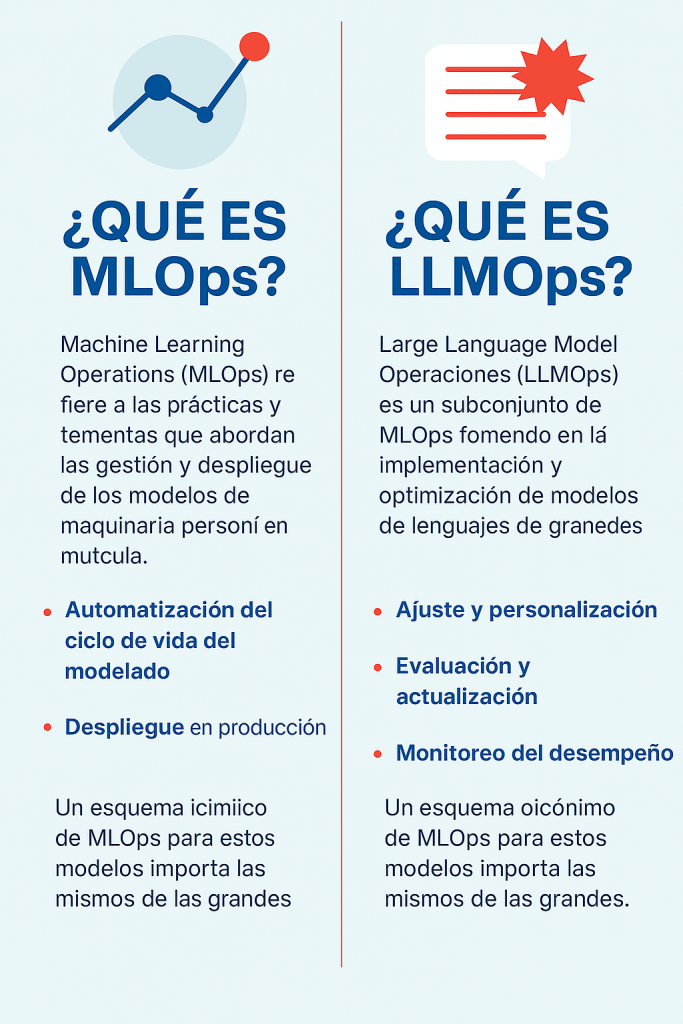 LLMOps, por su parte, es una evolución de MLOps enfocada exclusivamente en los modelos de lenguaje de gran tamaño (Large Language Models o LLMs), como los que usa ChatGPT. Estos modelos son más complejos, requieren mayor poder de cómputo y generan contenido más difícil de controlar. LLMOps se encarga de afinar estos modelos con datos propios de las empresas, vigilar la calidad de las respuestas que generan y garantizar que su uso sea seguro y alineado con los objetivos del negocio. En un contexto empresarial, LLMOps es esencial para integrar la IA generativa de forma efectiva, ética y sostenible.