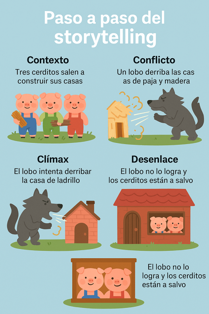 El storytelling se construye a partir de una estructura narrativa que tiene como objetivo emocionar y conectar con el público. Todo parte de un conflicto o necesidad: puede ser un desafío cotidiano, una situación inspiradora o un problema que interpela directamente al espectador. A partir de ahí, se crea un personaje —real o simbólico— que representa al público objetivo, y se le coloca en un viaje donde experimenta obstáculos, decisiones y aprendizajes. Esta estructura (inicio, conflicto, resolución) es la misma que usan las películas, novelas o series, y permite que el mensaje de la marca sea percibido de forma orgánica, no como una venta forzada.
