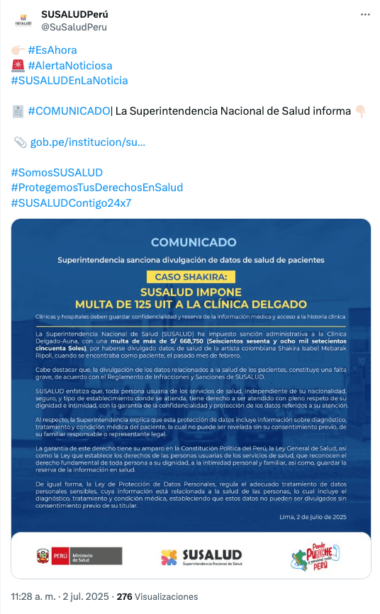 📢 Cuando hasta tu historia clínica puede volverse chisme, el problema ya no es solo de salud. Es de confianza. La Superintendencia Nacional de Salud (SUSALUD) le aplicó una multa histórica de S/668,750 a la Clínica Delgado-Auna. ¿El motivo? Filtrar sin autorización los datos médicos de la cantante Shakira durante su atención en Lima. La sanción equivale a 125 Unidades Impositivas Tributarias (UIT), una de las más altas impuestas a un establecimiento privado en el Perú por violar la confidencialidad médica.